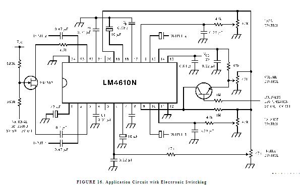 LM4610N features: (1)National 3-D Soundn ; (2)Wide supply voltage range, 9V to 16Vn ; (3)Large volume control range, 75 dB typicaln ; (4)Tone control, ±15 dB typicaln ; (5)Channel separation, 75 dB typicaln ; (6)Low distortion, 0.06% typical for an input level of 0.3Vrmsn ; (7)High signal to noise, 80 dB typical for an input level of0.3 Vrmsn Few external components required.
