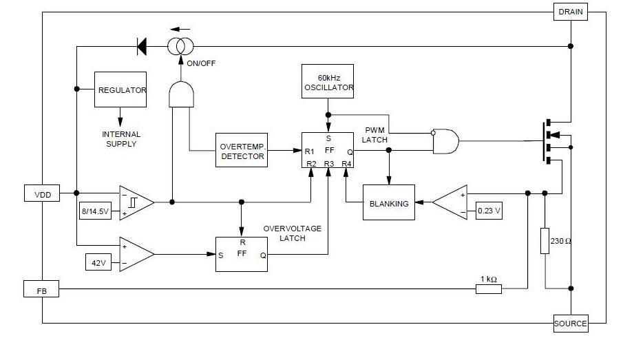 VIPER12A features: (1)fixed 60 KHz switching frequency; (2)9V to 38V wide range vdd voltage; (3)current mode control; (4)auxiliary undervoltage lockout with hysteresis; (5)high voltage start up current source; (6)overtemperature, overcurrent and overvoltage protection with autorestart.